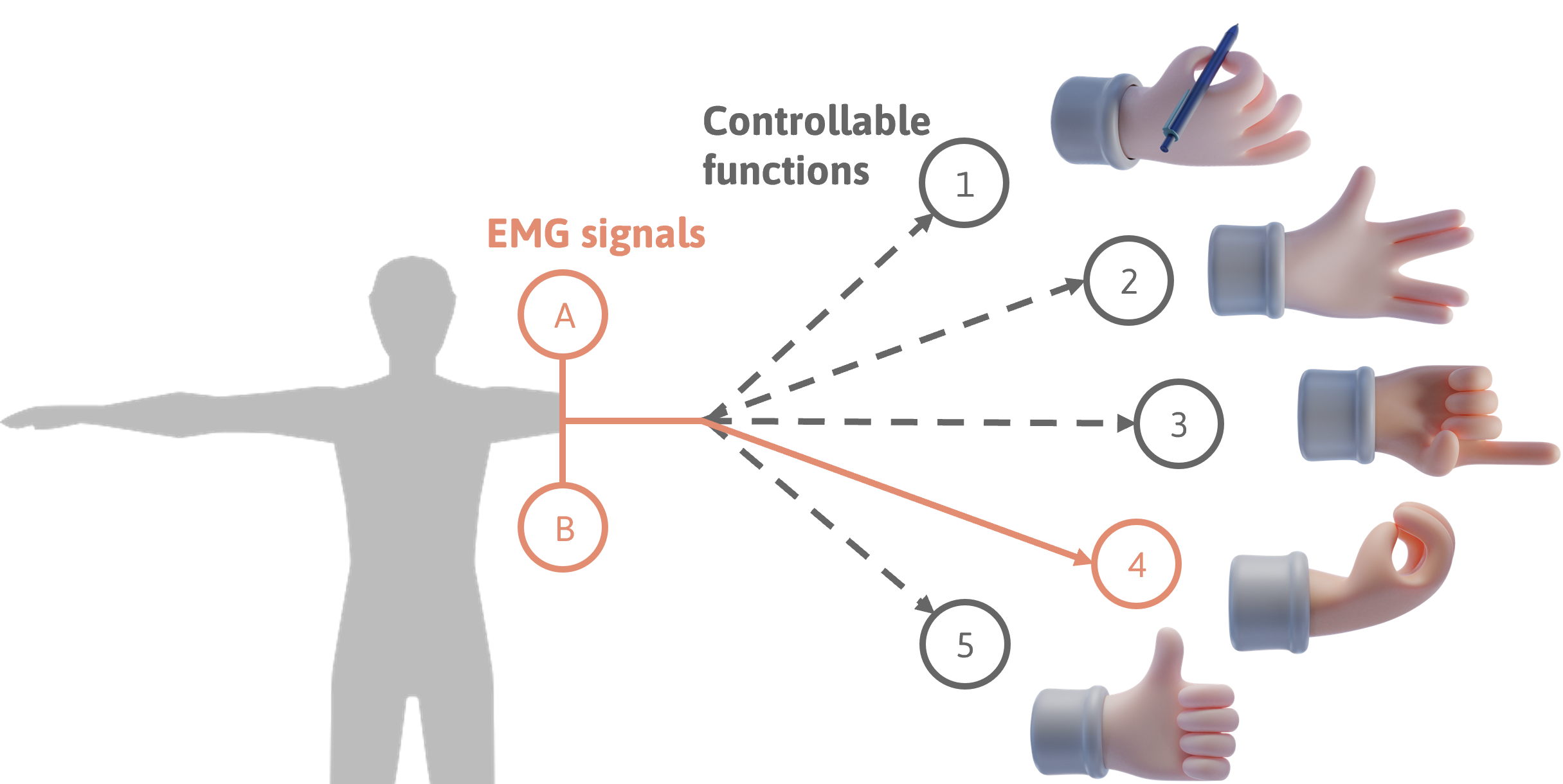 Using powered prosthetic hands is challenging for people with limb differences due to the difference between the many possible grasp patterns a device can support, and the limited number of control channels provided by the human body of someone who has lost a limb which can be seen below.